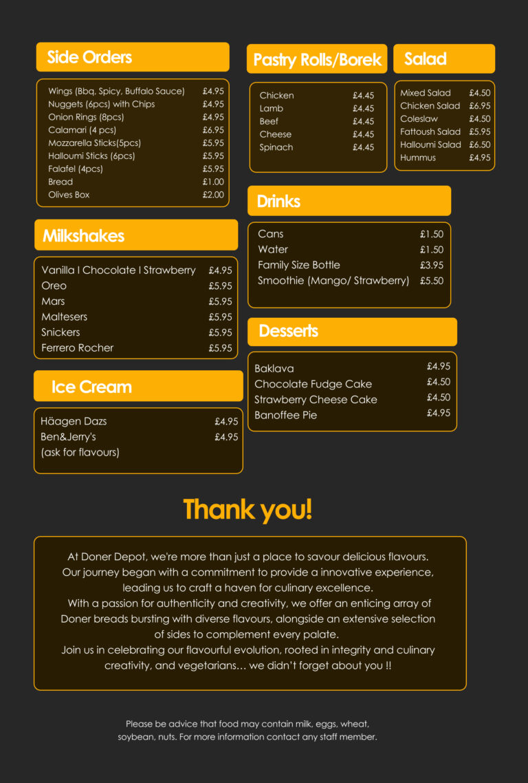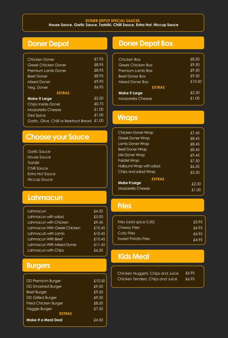 Whether you’re grabbing a quick meal or enjoying a leisurely afternoon, Doner Depot promises to satisfy your cravings with its exceptional menu. Come discover your new favorite spot!